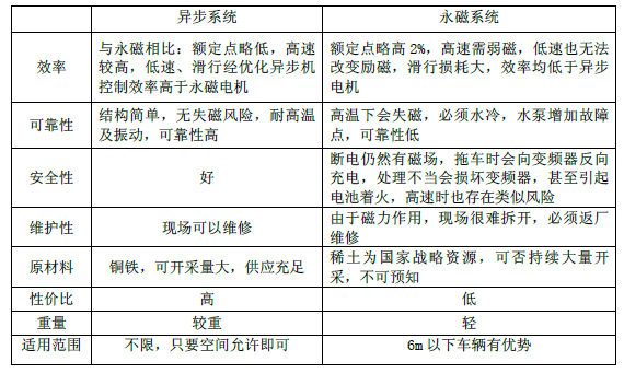 经过优化控制的异步电机与永磁电机相比电耗更少,且结构简单,工作可靠(不怕振动、耐高温),原材料供应充足,运行安全可靠、坚固耐用。国际主流电动车制造商特斯拉,在轿车上都坚持异步路线,且其电耗远低于国内同类产品;西门子电动大巴也是主推异步系统。目前高铁、动车、地铁、电力机车都在使用异步电机。