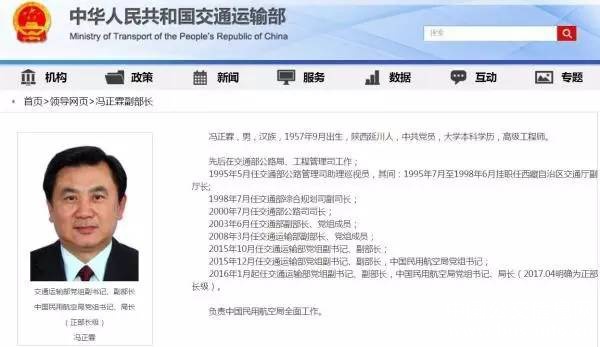 交通运输部官网“领导网页”栏目信息显示,现任交通运输部党组副书记、副部长,中国民用航空局党组书记、局长冯正霖(1957.9)已于2017年4月明确为正部长级。