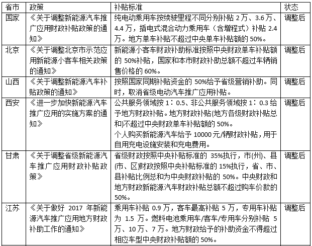 补贴新政里的这些要求,迫使地方政府不得不重新调整已出台的新能源汽车补贴政策。据第一电动网不完全统计,截至目前,北京、山西、西安、甘肃、江苏、天津六省市明确了2017年补贴标准。