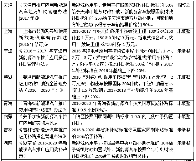 宁波2016年纯电动乘用车最高补助3万元,芜湖2016年纯电动乘用车最高补助2万元,两城市2017年补助标准在2016年基础上下降20%。青海、内蒙、吉林按国标50%补贴。湖南新能源乘用车按国标10%补贴。