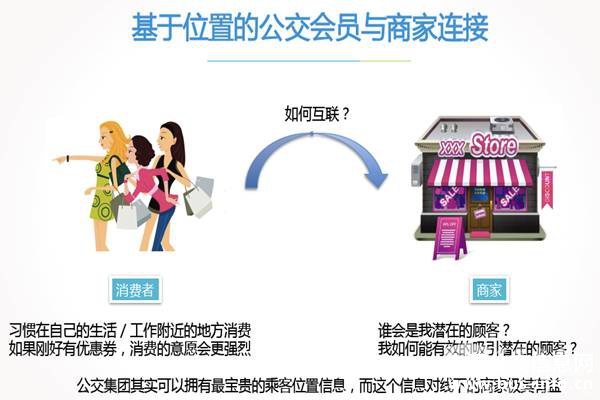 其次,通过阿里和杭州公交合作的“云公交服务”,利用移动支付,把线下乘客转化为线上会员,实现公交数据运营服务,利用公交车的站点定位,把公交乘客会员与商家连接,通过云平台了解会员的消费习惯,进而定向推送产品广告和消费卡券。