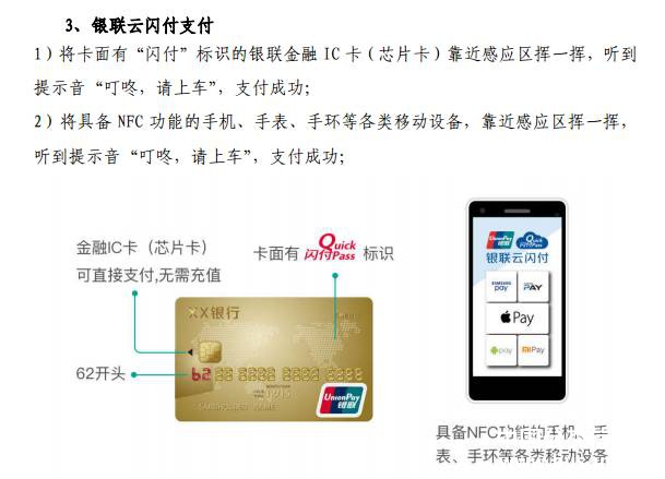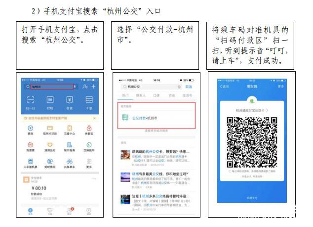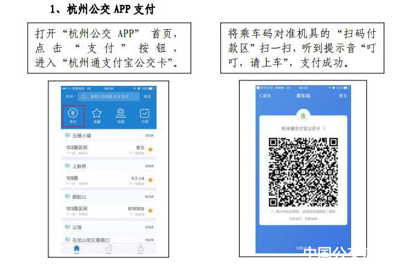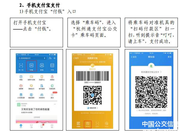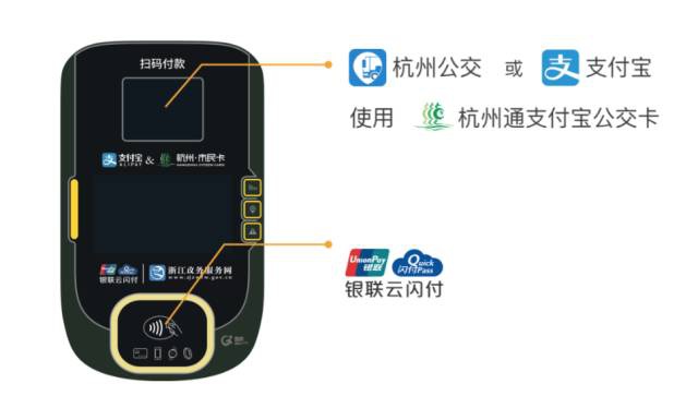 自5月23日起,杭州公交集团正式启动公交车移动支付一体机安装工作,至6月底前,杭州市主城区所有公交车将实现移动支付全覆盖。杭州公交推行的移动支付包括了杭州通支付宝公交卡二维码扫码支付和银联云闪付,同时融合了现有的公交IC卡的刷卡支付,实现了一体机全支付。使用支付宝的乘客,打开杭州公交APP,点击“支付”,或打开支付宝首页“付钱”,页面下方点击“乘车码”,领取“杭州通支付宝公交卡”后,就能生成“杭州通支付宝公交卡”二维码,对准POS上方标注有“支付宝&杭州市民卡”的扫码付款区,听到“叮叮,请上车”的声音即可;持有境内外任一银行发行的“62”字头银联金融IC卡(芯片卡)或具有银联云闪付功能的手机、手表、手环的乘客,只需将银联金融IC卡或手机、手表、手环对准POS机下方标注有“银联云闪付” 标注的刷卡区一挥,听到“叮咚,请上车”即可。