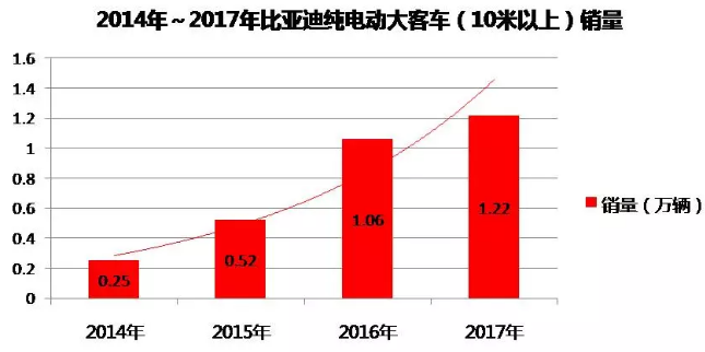 2017年,在全国新能源客车整体销量同比大幅下滑背景下,比亚迪客车实现逆势增长,全年销量14336辆(全部为纯电动,含控股公司广汽比亚迪1559辆),同比增长8%。其中,8米以上销量达14254辆,同比增长13.6%,占总销量99%;10米以上销量达12228辆,同比增长14.5%,占总销量85%,位居全国新能源大客车销量第一!
