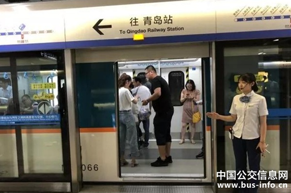 青岛地铁3号线,站务人员引导乘客有序上下车。