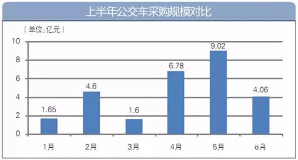 1月-6月的公交车采购金额分别为1.65亿元、4.6亿元、1.6亿元、6.78亿元、9.02亿元和4.06亿元。采购项目共有60个,分别为5个、4个、9个、19个、19个和9个。可以看出,前三个月公交车采购金额较少,从4月开始升温,到5月的采购金额达到最高,可谓直线拉动了公交车总采购金额。