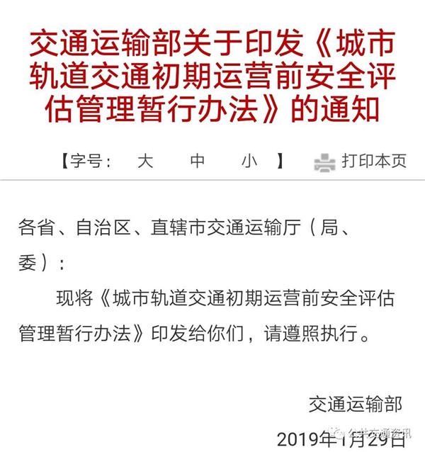 交通运输部关于印发《城市轨道交通初期运营前安全评估管理暂行办法》的通知