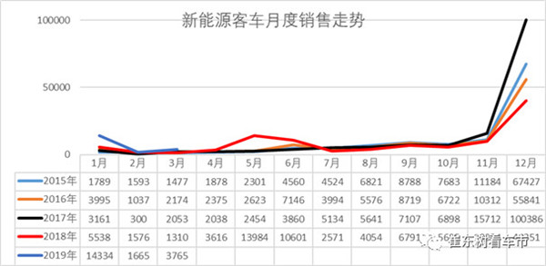 在中国客车市场全年的销量中,新能源占据了举足轻重的作用,改变了中国客车市场的销售规律,每年12月份新能源客车销售高峰对全年销售贡献度极高。