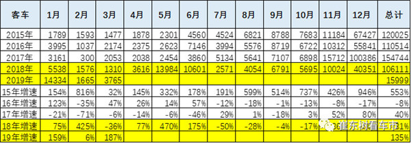 2019年新能源车增长总体很强,其中乘用车增长突出,新能源客车19年1-3月1.9万台,同比增长135%,增长表现突出,这也是政策推动新能源车转型乘用车高质量增长的效果充分体现。19年1-3月代表技术趋势的乘用车的表现突出,历年1-3月客车占比仅有全年的5%,19年占比预计达到15%左右,目前看改善较大。