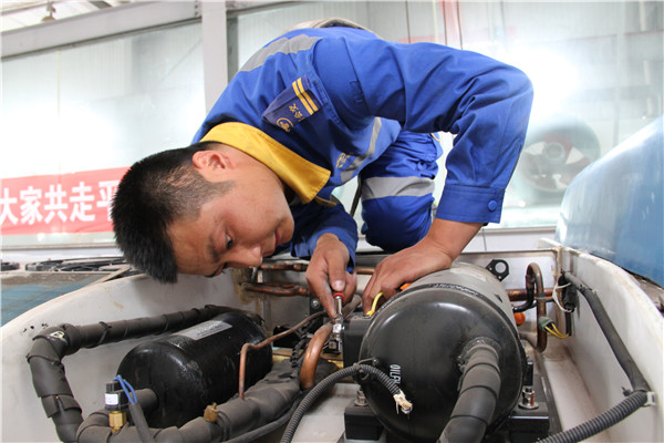 图为6月25日,该公司汽车维修分公司技术员吴少鹏正在对53路公交车车顶空调系统进行检修。