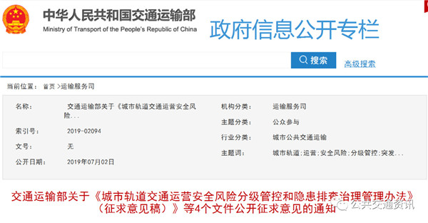 为进一步加强城市轨道交通运营管理制度体系建设,保障运营安全,提高服务质量,促进城市轨道交通行业健康发展,交通运输部研究起草了《城市轨道交通运营安全风险分级管控和隐患排查治理管理办法(征求意见稿)》《城市轨道交通设施设备运行维护管理办法(征求意见稿)》《城市轨道交通运营突发事件应急演练管理办法(征求意见稿)》《城市轨道交通运营险性事件信息报告与分析管理办法(征求意见稿)》4个文件,现向社会公开征求意见。公众可以通过以下途径和方式提出意见: