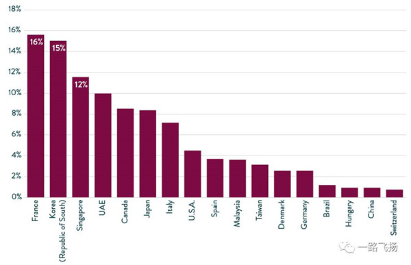 近一半的全自动驾驶线路集中在4个国家,即法国、韩国、新加坡和阿联酋,法国以16%的全自动驾驶线路领先,韩国以15%紧随其后。
