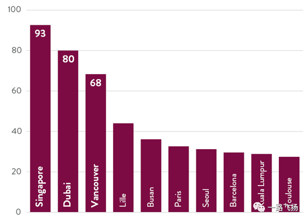 全自动驾驶线路里程最多的城市为新加坡(93km)、迪拜(80km)和温哥华(68km)。