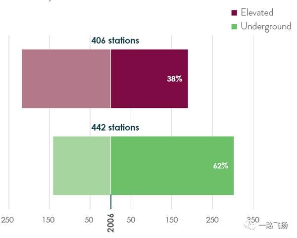 全自动驾驶线路中地下站和高架站大致相当,但过去十年中建成的车站60%以上为地下站。