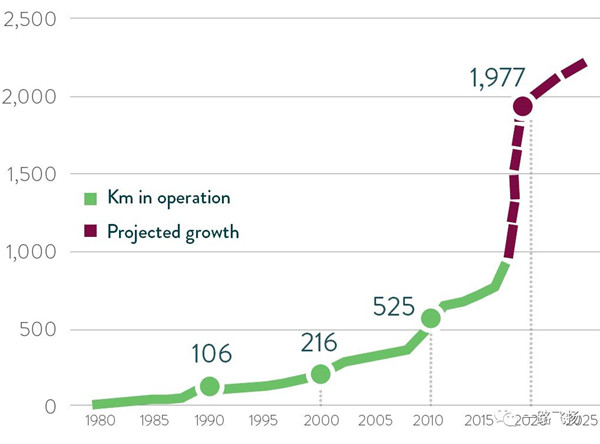 在全自动驾驶线路实施30年以来,每十年线路里程翻一番。根据已确认的项目,预计到2025年,将有超过2300公里的全自动驾驶线路运行。