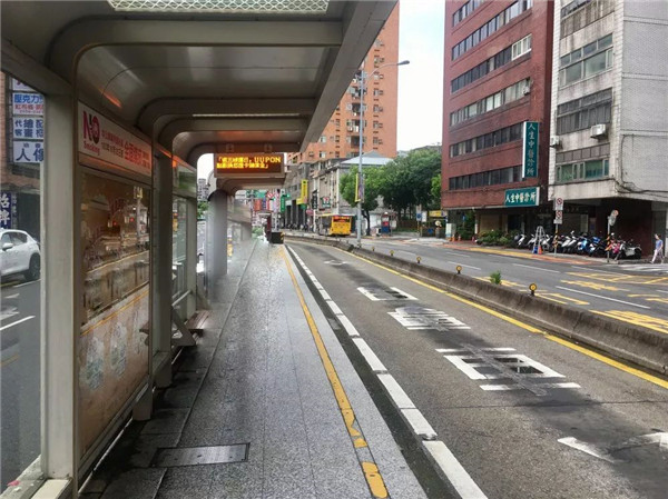 台北有很多路中式公交专用道,公交车辆行驶享有专用路权,减少车辆行驶过程中社会车辆的干扰。公交站台采用路中侧式,分布在公交专用道的两侧。站台上功能比较齐全,有乘客座椅、公交线路信息显示牌、电子显示屏(可实时显示公交车辆信息)、垃圾桶等。