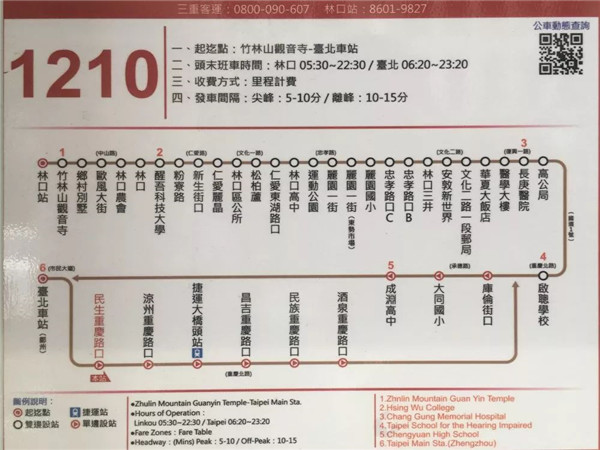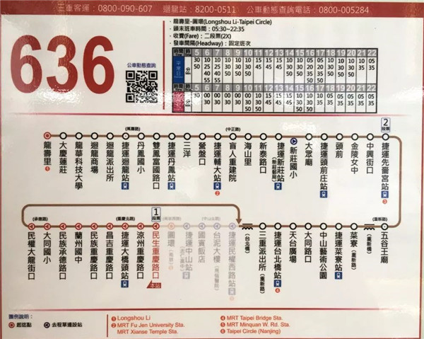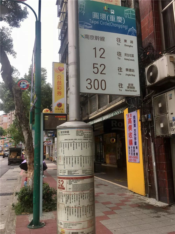 台北的公交站牌主要是圆柱形和方形。圆柱形站牌较为清晰、简洁、直观,可以很方便的看到线路号和线路行驶方向,如果想要获取更多关于公交线路的信息,可以在圆柱上找到公交站点、发车时间等详细信息。方形站牌类似于展开的圆柱形站牌,显示信息较全,有起终点、首末班车时间、中途站、收费方式、发车间隔、换乘信息等。