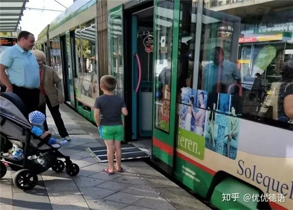 公交车的车身可以倾斜,当有婴儿车或老年人上下车时,它会放低车门那侧的车身,让车门跟站台基本持平,方便他们上下车。德国公交车有三分之一左右的座位是老弱病残孕保留座,用蓝十字标记,十分醒目。保留座位于车厢前半部分,靠近前门和中门,上下比较方便。