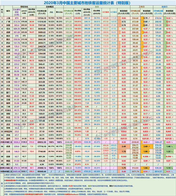 1. 城市范围:包含2020年3月已开通地铁(除有轨电车、云轨、铁路运营的市域铁路等)的内地35座城市(佛山数据列入广州),及港澳台5座城市(香港、台北、桃园、高雄、澳门),全中国共计40座城市(暂缺乌鲁木齐、徐州2城)。