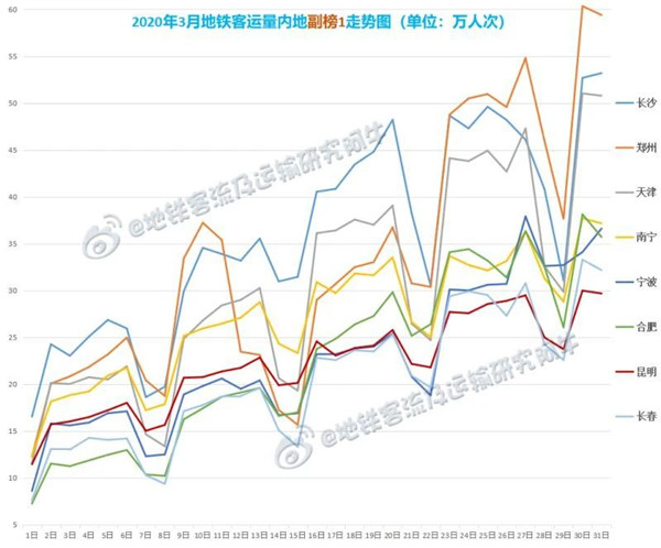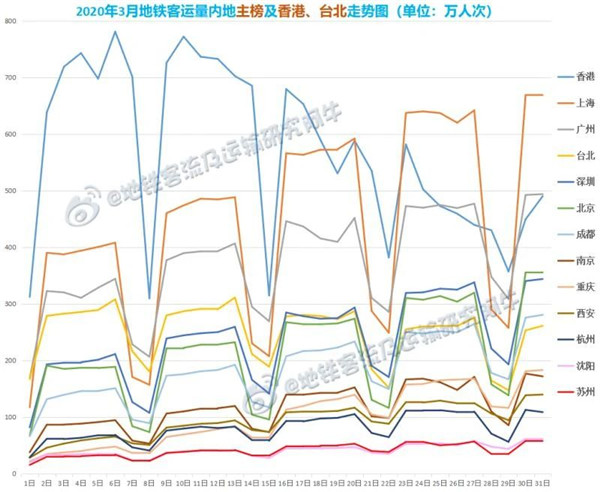 A、环比上月:2月是内地受疫情影响最为严重的一个月,3月是疫情缓解后客流恢复的一个月,疫情对地铁客流的影响详情可参见笔者早前写的另外一篇《疫情肆掠下的武汉“封城”与中国地铁客流变迁》一文,结合疫情数据变化同步分析了客流的变化趋势,本文重点不在于分析疫情,重在呈现3月的客流数据本身。