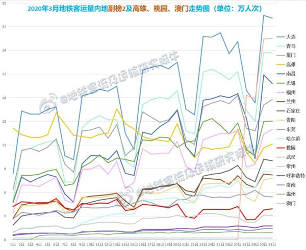 内地35城之中,3月之中温州4日、武汉28日重启地铁运营,内地平均环比2月增幅达247.23%,即3月为2月的约3.5倍。从表上看,主要城市上海(219+%)、广州(184+%)、北京(136+%)未跑赢平均水平;深圳(280+%)、成都(350+%)、南京(359+%)较快跑赢,而重庆(586+%)、西安(586+%)高速增长;而增速更大的有呼和浩特(33+倍)、昆明(7+倍)属于上月有全部或者部分线路停运引起的基数太小,导致3月增速过大。