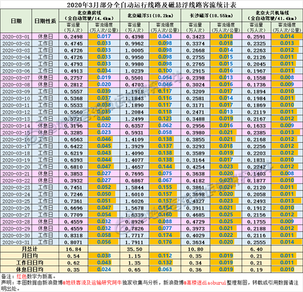 说明:(1)燕房线与大兴机场线均由北京轨道交通运营管理公司管理,燕房线为中国第一条具有自主知识产权的全自动运行线路,具有国产化示范效应;大兴机场线为目前国内开通旅行速度最快的地铁线,设计时速160公里,平均旅行速度近110km/h(上行105.5/下行112.37),主流地铁线路旅行速度为33至35km/h,因此特关注并列出两线客流供研究参考。