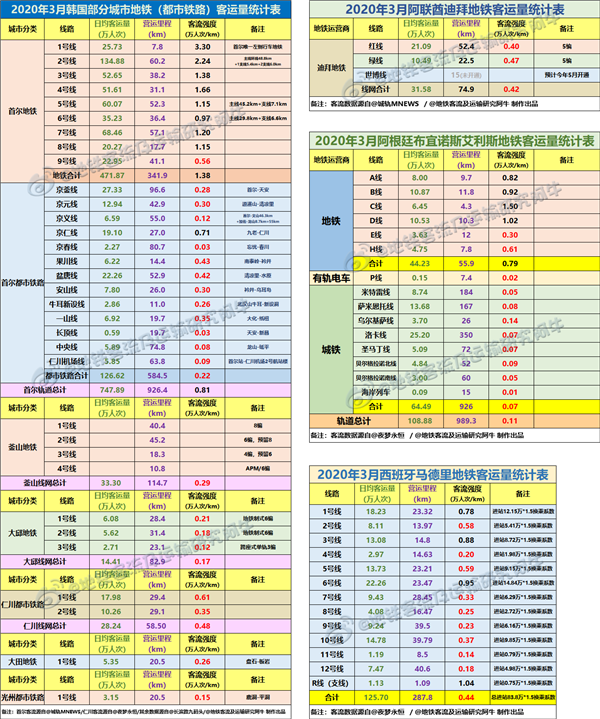 附表2:2020年3月TA国地铁客流(韩国首尔、釜山、大邱、仁川、大田、光州,阿联酋迪拜、阿根廷布宜诺斯艾利斯、西班牙马德里)