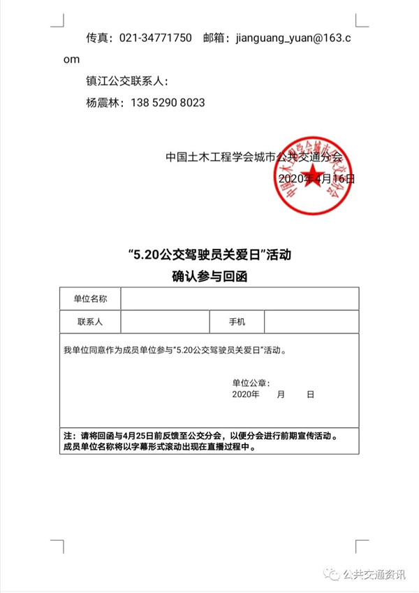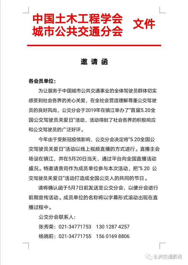 今年由于受新冠疫情影响,公交分会决定将“5.20全国公交驾驶员关爱日”活动以线上视频直播的方式进行。直播主会场设在镇江,并在5月20日当天,通过平台向全国直播活动盛况。特邀请贵司作为成员单位参与本次活动,把“5.20 公交驾驶员关爱日”活动打造成全国公交人的共同的节日。