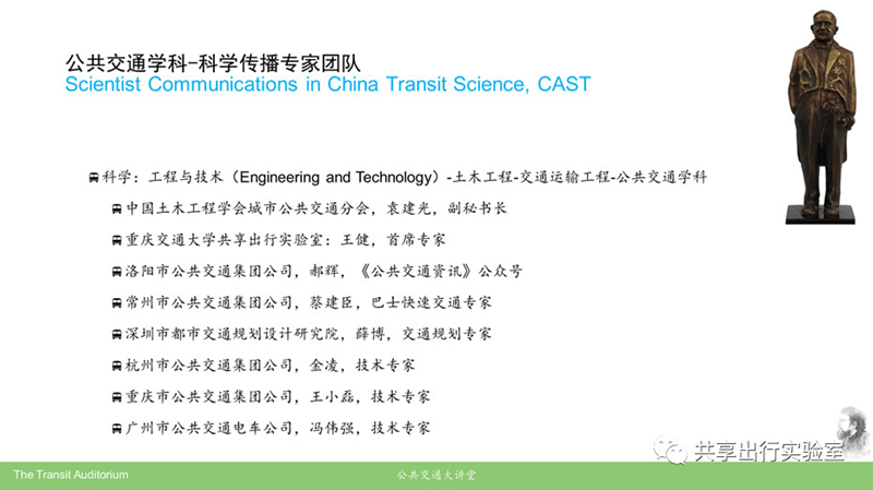 公共交通学科首席科学传播专家团队(Expert Team for Public Transport),是在中国土木工程学会城市公共交通分会领导下,由全国公共交通行业具有较高学术造诣,热爱科普、支持科普、奉献科普的公共交通相关领域的科技工作者组成,专家团队首批成员包括:《公共交通大讲堂》(Transit Auditorium)是由公共交通学科首席科学传播专家王健团队主持的系列学术交流研讨会,同期也配合不同主题组织一些社会活动。2019年在青岛与公交集团一起组织的“我爱公共交通”的航空拍摄活动,通过中国客车网进行了现场直播,《青岛晚报》在头版刊载的照片引起民众极大的兴趣,软银证券也选用这张照片来分析中国客车出口的机遇与挑战,在中国大众媒体和专业咨询机构中都产生良好的反应。
