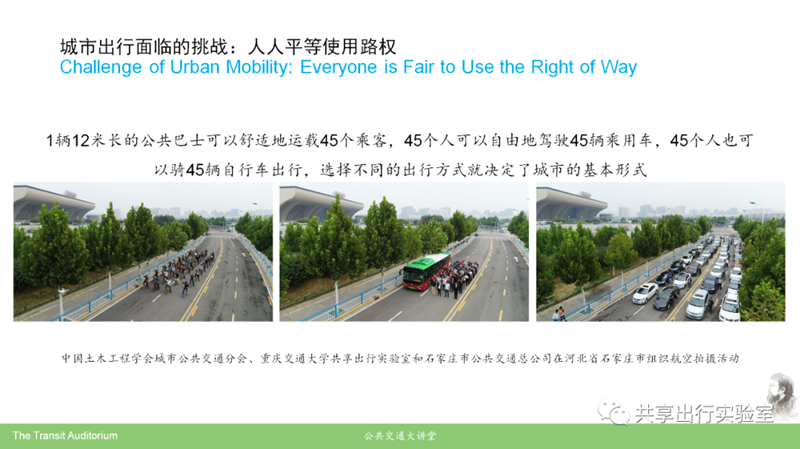 2018年在石家庄与公交集团一起组织的和“人人平等使用路权”航拍活动,展现城市道路上45人选择公共巴士、自行车和私人汽车出行的三种场景,这组照片直观地让人们判断什么方式是可持续城市出行。
