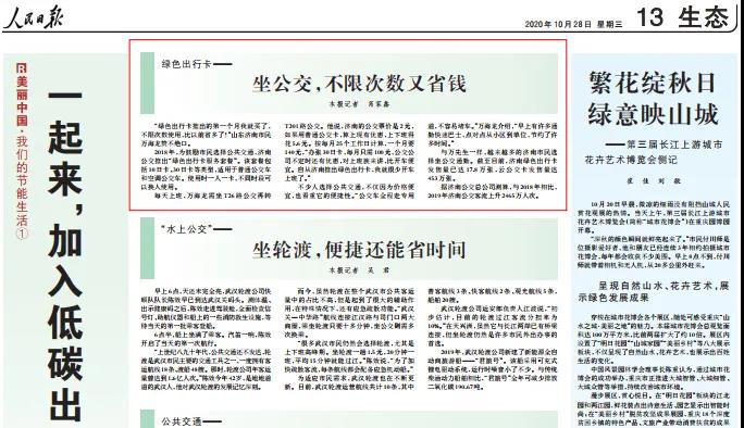 近日,人民日报刊发题为《坐公交,不限次数又省钱》的文章,点赞了济南公交“绿色出行卡”,介绍了济南市在推行公交优先、鼓励绿色出行方面推出的优惠举措。