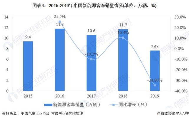 我国新能源客车销量在2016年达到近几年来销量的最高值,主要得益于各地方政府在公共领域积极推广新能源汽车,带动了新能源客车的市场规模提升。2017-2018年,随着政策和市场需求的变化,我国新能源汽车销量波动趋势较明显,2019年,销售7.63万辆,较2018年下降幅度较大。