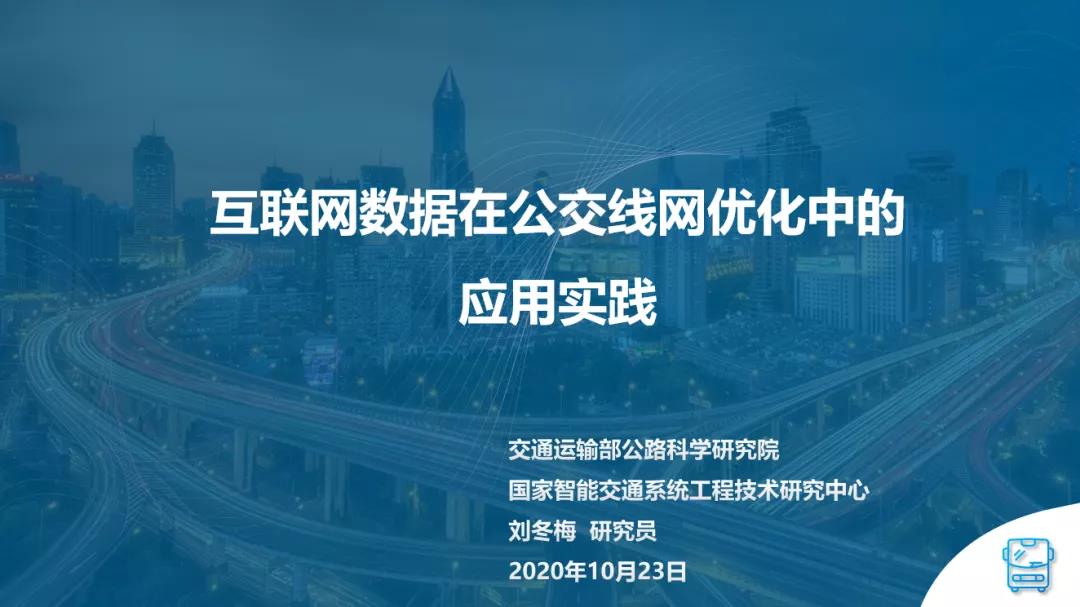 10月23日,交通运输部公路科学研究院交通大数据创新团队负责人刘冬梅在京津冀智能交通发展论坛暨2020年北京智能交通大会进行了“互联网数据在公交线网优化中的应用实践”的主题演讲,刘冬梅从我国公共交通智能化行业现状、线网优化需求和数据如何赋能等三个方面做了详细介绍。