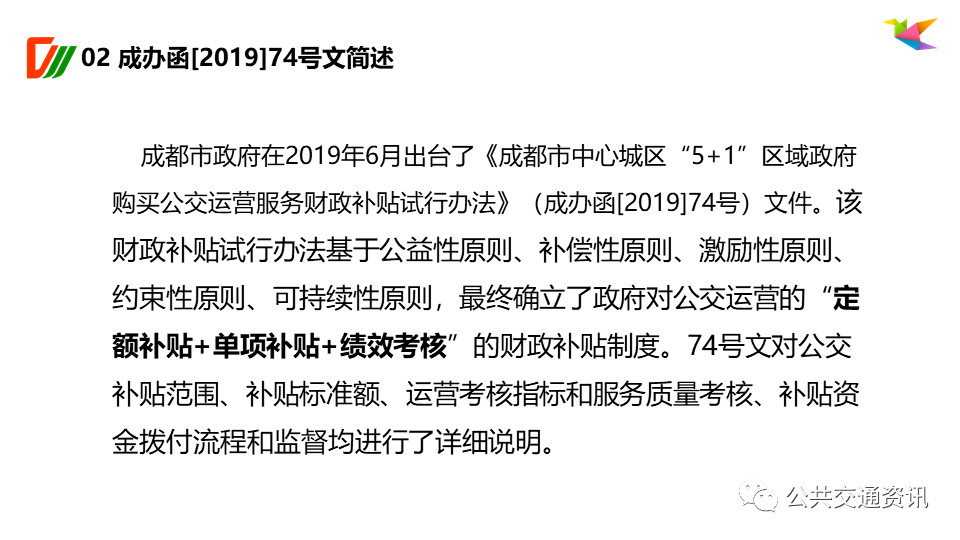 该财政补贴试行办法基于公益性原则、补偿性原则、激励性原则、约束性原则、可持续性原则,最终确立了政府对公交运营的“定额补贴+单项补贴+绩效考核”的财政补贴制度。财政补贴试行办法文件中对公交补贴范围、补贴标准额、运营考核指标和服务质量考核、补贴资金拨付流程和监督均进行了详细说明。
