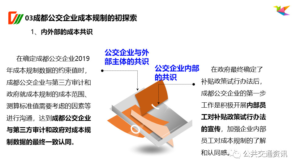 成本规制是对公交企业的传统成本管理思维的冲击,是成都公交企业的成本变革。企业的每一项变革都会在初期受到多方的变革阻碍,其中企业内部员工的认同在很大程度上影响着变革的进程。因此,在政府最终确定了补贴政策试行办法后,成都公交企业的第一步工作就是积极开展内部员工对补贴政策试行办法的宣传,对成本规制实施的大背景、必要性、重要性进行传达和学习,加强企业内部员工对成本规制的了解和认同感。