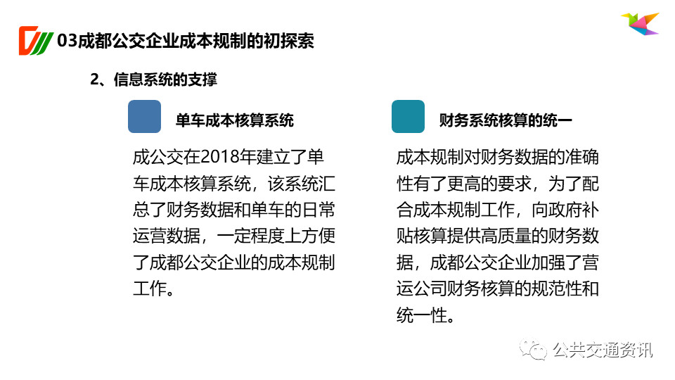 新的财政补贴机制对公交企业的财务数据和营运数据有了更高的准确性需求,而成都公交企业的这些数据存在于不同的软件系统。成都公交企业建立了单车成本核算系统,将财务数据和营运数据接入同一个系统,该系统不仅能显示实时数据,还清楚明了地显示单车的多项成本数据,该系统对成都公交企业的成本规制工作提供了很大的信息技术上的辅助。