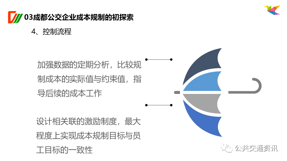 在控制流程方面,成都公交会每月分析单车运营的里程、人次情况,讨论单车的运营数据未达标原因,进而指导单车下个月的工作。控制环节除了对数据的分析和调整,还涉及奖惩和激励。成本规制的培训流程在一定程度上能从意识上统一企业员工的工作目标,但还需要对其设计相关联的激励制度,成都公交企业也在积极的探索成本规制下员工激励制度的建设。