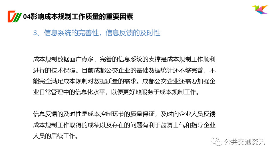成本规制所需数据比较多,且对成本的实时分析和调整要求较高,完善、充足的信息系统的支撑是成本规制工作顺利进行的技术保障。目前成都公交企业的基础数据统计还不够完善,不能完全满足成本规制对数据质量的需求。公交行业的数据多而杂,大量数据通过人工统计和梳理不仅进度较为滞后,且管理效率和数据真实性较差,不利于成本动态管理。成都公交企业还需要加强企业日常管理中的信息化水平,以便更好地服务于成本规制工作。