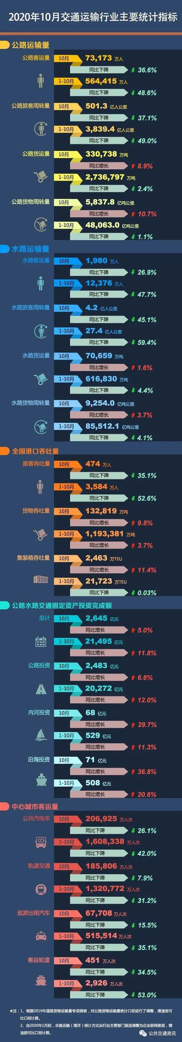 公共汽电车:10月客运量206,925万人次,同比下降26.1%;1~10月客运量1,608,338万人次,同比下降42.0%。