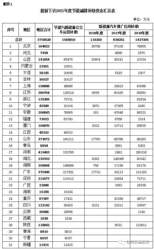 根据《关于2016-2020年新能源汽车推广应用财政支持政策的通知》(财建〔2015〕134号)、《关于完善城市公交车成品油价格补助政策 加快新能源汽车推广应用的通知》(财建〔2015〕159号)、《关于调整新能源汽车推广应用财政补贴政策的通知》(财建〔2016〕958号)、《关于调整完善新能源汽车推广应用财政补贴政策的通知》(财建〔2018〕18号)、《关于进一步完善新能源汽车推广应用财政补贴政策的通知》(财建〔2019〕138号)、《关于支持新能源公交车推广应用的通知》(财建〔2019〕213号)、《关于完善新能源汽车推广应用财政补贴政策的通知》(财建〔2020〕86号)等文件有关规定,现提前下达你省(区、市)2021年节能减排补助资金(具体见附件),用于2019年度节能与新能源公交车运营补助资金、2016-2018年度新能源汽车推广应用补助资金清算。
