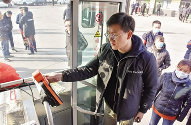 165路“刷脸”支付步骤为:上车后乘客正面对准刷脸终端屏幕,保持10-60厘米合适距离,将面部放入圆形人脸框内,红外探头将进行测温(红外探头测量范围有限,因此只能识别到刷脸乘客的温度)、识别、扣费等流程。