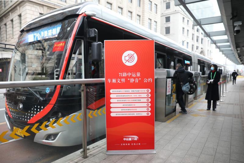 继京沪高铁设置静音车厢、上海地铁颁出“静音令”后,上海公交主干线路——中运量71路于2021年1月5日正式推出车厢文明静音公约,进一步倡导市民乘客文明乘车。