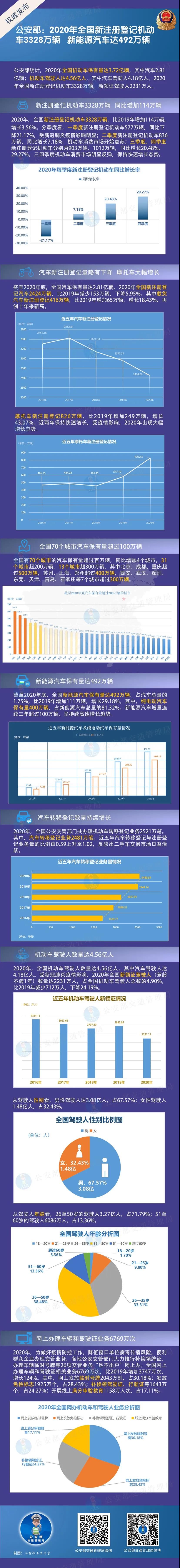 公安部统计,2020年全国机动车保有量达3.72亿辆,其中汽车2.81亿辆;机动车驾驶人达4.56亿人,其中汽车驾驶人4.18亿人。2020年全国新注册登记机动车3328万辆,新领证驾驶人2231万人。新注册登记机动车3328万辆,同比增加114万辆。2020年,全国新注册登记机动车3328万辆,比2019年增加114万辆,增长3.56%。分季度看,一季度新注册登记机动车577万辆,同比下降21.17%,受新冠肺炎疫情影响明显;二季度新注册登记机动车836万辆,同比增长7.18%,机动车消费市场开始复苏;三季度、四季度新注册登记机动车分别为903万辆、1012万辆,同比增长20.48%、29.27%,三四季度机动车消费市场明显反弹,保持快速增长态势。汽车新注册登记量略有下降,摩托车大幅增长。截至2020年底,全国汽车保有量达2.81亿辆,2020年全国新注册登记汽车2424万辆,比2019年减少153万辆,下降5.95%。其中载货汽车新注册登记416万辆,比2019年增加65万辆,增长18.43%,再创十年来新高。摩托车新注册登记826万辆,比2019年增加249万辆,增长43.07%,近两年保持快速增长,受疫情影响,2020年出现大幅增长态势。全国70个城市汽车保有量超过100万辆。全国有70个城市的汽车保有量超过百万辆,同比增加4个城市,31个城市超200万辆,13个城市超300万辆,其中北京、成都、重庆超过500万辆,苏州、上海、郑州超过400万辆,西安、武汉、深圳、东莞、天津、青岛、石家庄等7个城市超过300万辆。新能源汽车保有量达492万辆。截至2020年底,全国新能源汽车保有量达492万辆,占汽车总量的1.75%,比2019年增加111万辆,增长29.18%。其中,纯电动汽车保有量400万辆,占新能源汽车总量的81.32%。新能源汽车增量连续三年超过100万辆,呈持续高速增长趋势。汽车转移登记数量持续增长。2020年,全国公安交管部门共办理机动车转移登记业务2521万笔。其中,汽车转移登记业务2481万笔。近五年汽车转移登记与注册登记业务量的比例由0.59上升至1.02,反映出二手车交易市场日益活跃。机动车驾驶人数量达4.56亿人。2020年,全国机动车驾驶人数量达4.56亿人,其中汽车驾驶人达4.18亿人。受新冠肺炎疫情影响,2020年全国新领证驾驶人(驾龄不满1年)数量达2231万人,占全国机动车驾驶人总数的4.90%,比2019年减少712万人,下降24.19%。从驾驶人性别看,男性驾驶人达3.08亿人,占67.57%;女性驾驶人1.48亿人,占32.43%。从驾驶人年龄看,26至50岁的驾驶人3.27亿人,占71.79%;51至60岁的驾驶人6086万人,占13.36%。