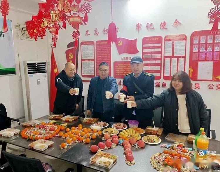 六公司为了活跃除夕站停时间,安排公交歌手马静为职工献唱,大家欢聚一堂,在欢歌笑语中共度跨年夜。车队还提前准备了水果、糖果、花生、瓜子,摆成了象征团圆的形状。大家休息时围坐在一起,享受片刻的放松和欢愉,驾驶员们纷纷表示虽然奋战在一线不能与家人团聚,但我们公交的跨年夜也是别具特色的。