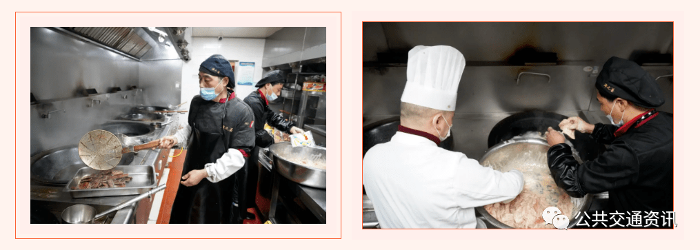 下午1点,所有的饭菜都已经盛好,放进一次性餐盒,等待各基层车队管理人员陆续抵达领取年夜饭,完成最终的配送。记者在现场观察到,多数车队都是安排了几路人马,把年夜饭送到各条线路的终点站,确保所有司乘人员都能吃到新鲜可口的饭菜。