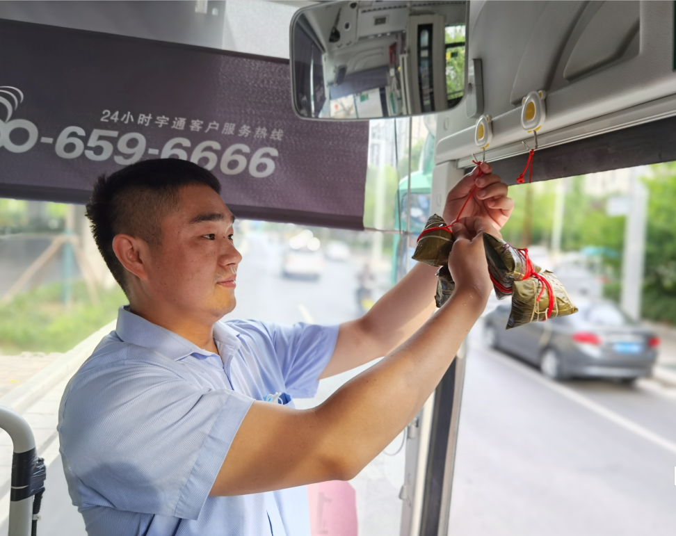 “同学们,大家上车的时候,抬手摸一下车门上方的粽子,祝大家今年能‘一举高粽’。”6月7日早上,在郑州市嵩阳中学“高考定制专线”公交车门口,32车长贾永斌对每一位上车的考生送上祝福的话语和“祝福卡”,希望他们考出好成绩。