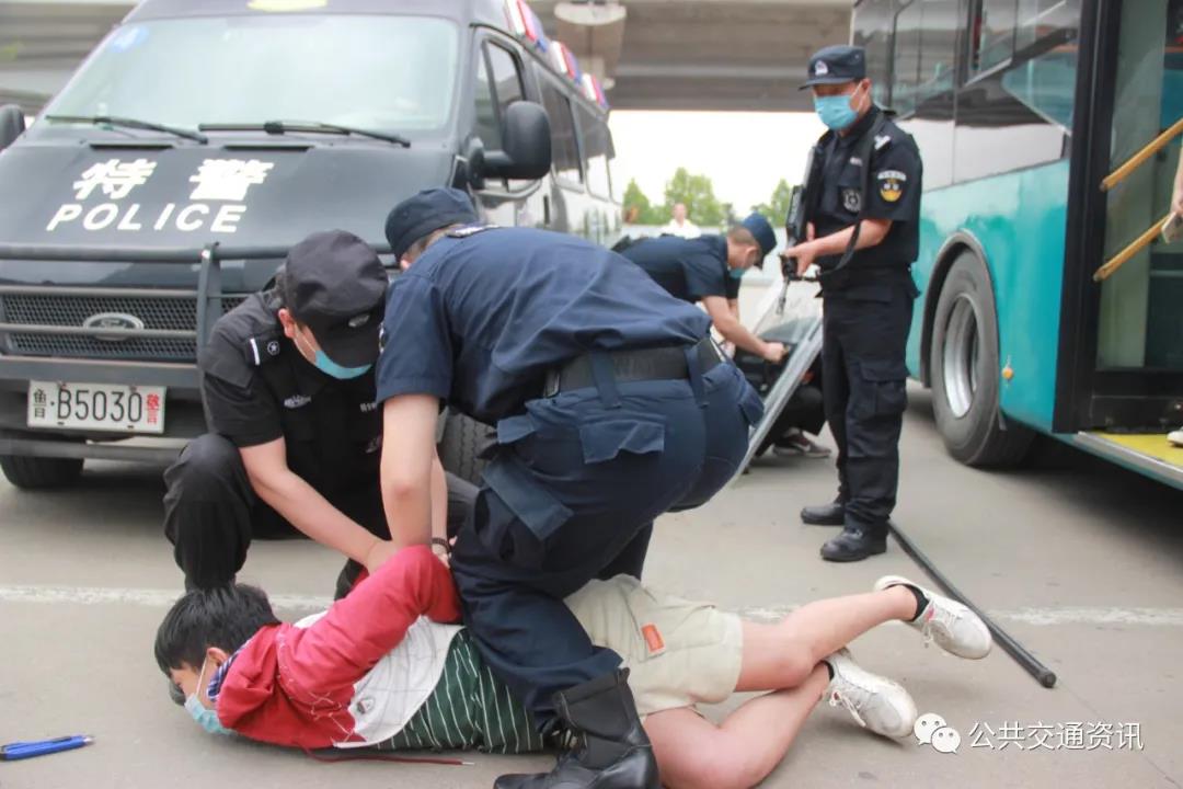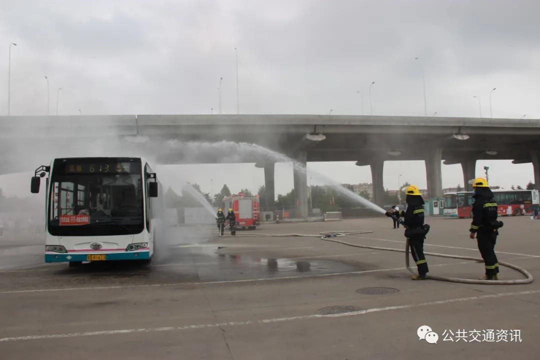 当日上午10时许,公交车防恐消防综合应急演练在汽车北站场站上演。现场,一辆613路公交车行驶至站台等待乘客上下车时,两名携带汽油的“歹徒”趁着拥挤的人群挤上车,乘务管理员识破一名“歹徒”携带的矿泉水瓶内装有汽油,上前试图阻拦并与其对峙,“歹徒”掏出藏在包里的菜刀想要挟持驾驶员,驾驶员见状迅速打开车门疏散乘客,迅速报警。这时另一名潜伏的“恐怖分子”在乘客慌乱之中趁机拿出打火机点燃汽油扔向车厢。此时,接到报警的公安部门赶到现场,将“恐怖分子”制服并带上警车。驾驶员摆脱危险后赶紧拿起车厢灭火器对现场火情进行控制,就在这时,消防车也迅速赶至现场,消防官兵们将高压水枪对准车厢,不到10分钟结束险情。