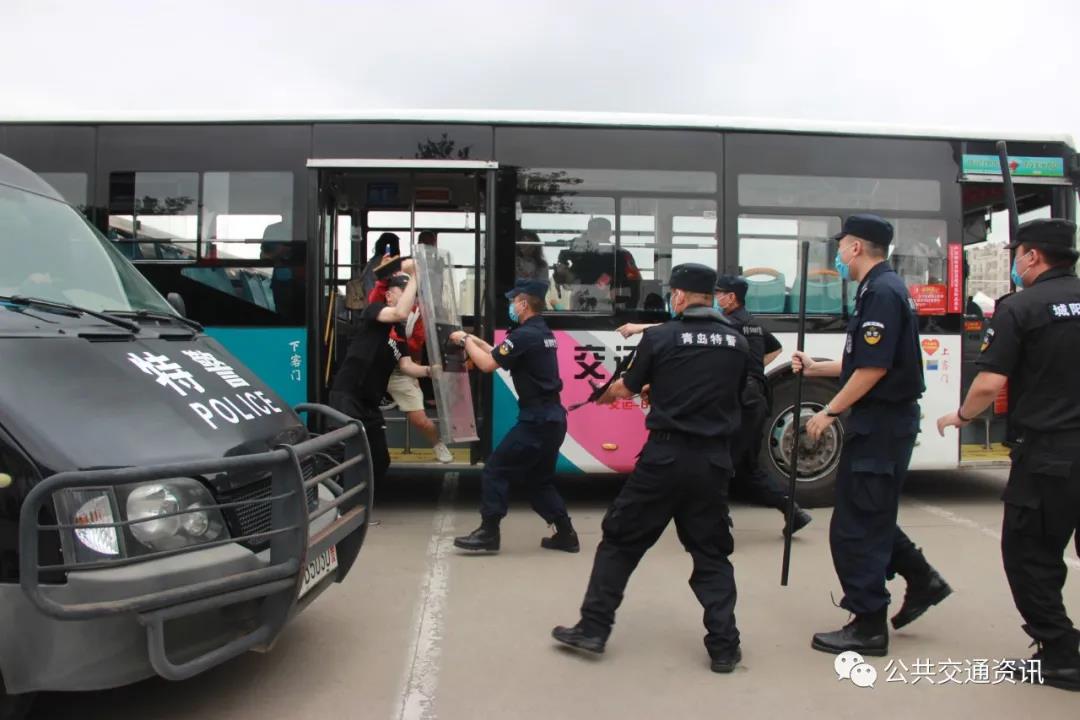 6月16日上午,在青岛城运控股交运温馨巴士通达分公司汽车北站场站内,几名特警将一辆公交车团团围住,对车内纵火的“歹徒”展开强攻,并顺利将其制服,随后消防车迅速处置火情……原来这是由青岛城运控股交运温馨巴士通达分公司联合青岛市公安局城阳分局反恐大队、特巡警大队、流亭消防中队、流亭派出所和多邦保安公司联合举行的防恐消防综合应急演练。
