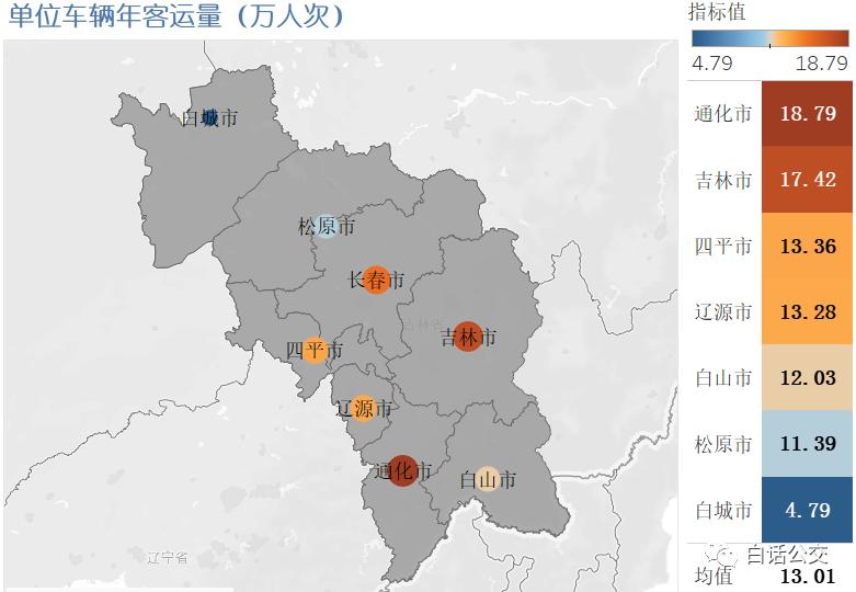 单位车辆客运量:市辖区范围内单位车辆年客运量平均为13.01万人次,其中最大为通化市(18.79万人次/年),最小的为白城市(4.79万人次/年)。