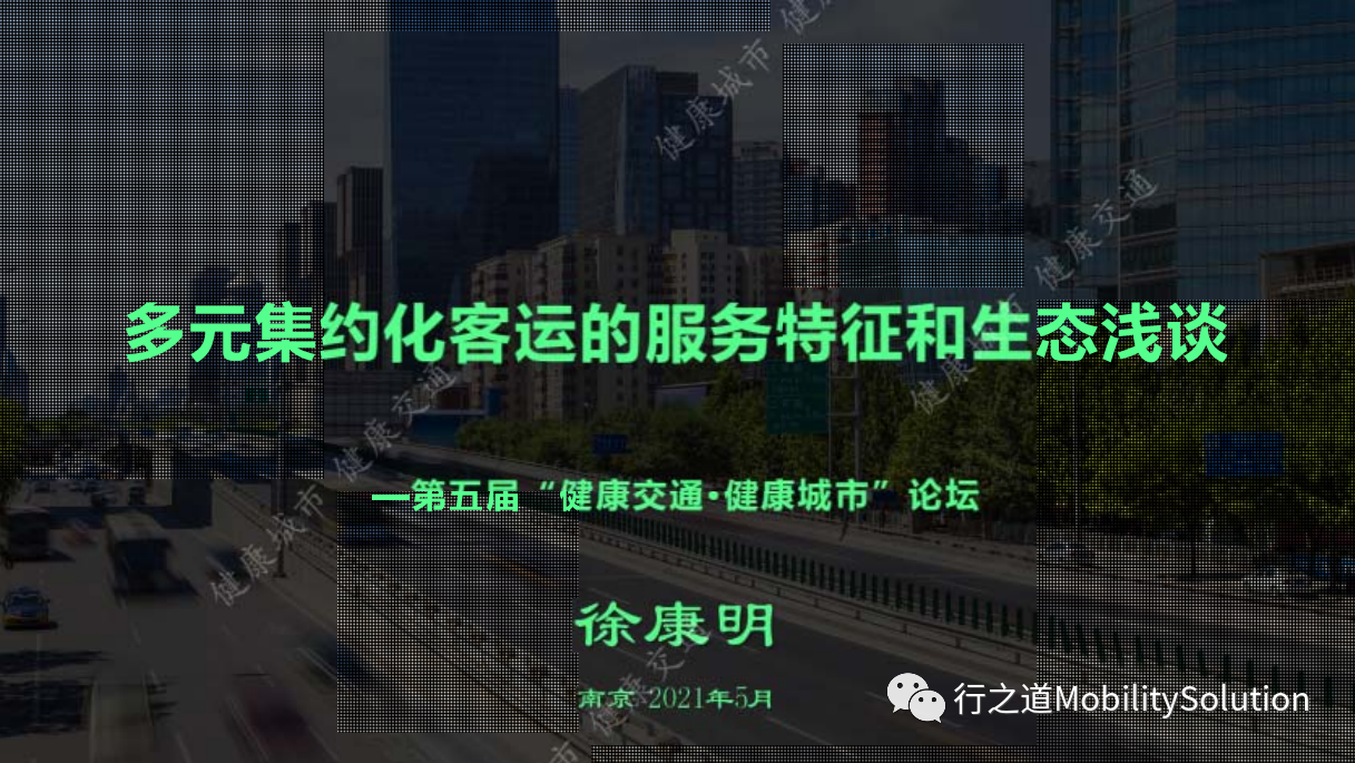 2021年5月28日,第五届“健康交通·健康城市”论坛在南京成功举办,本次论坛主题为“营造全域公交体系与服务,推进全域TOD开发”。论坛上,徐康明做了《多元集约化客运的服务特征和生态浅谈》的主题演讲。