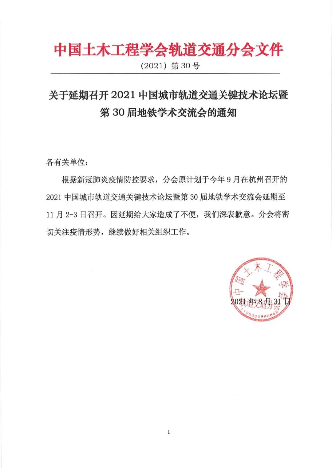 关于延期召开2021中国城市轨道交通关键技术论坛暨第30届地铁学术交流会的通知